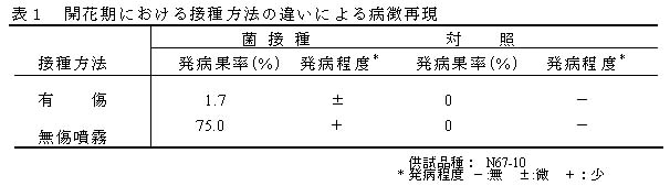 開花期に接種方法を変えて病徴再現を実施したところ、有傷接種では非常に低い発病であるが、無傷噴霧接種では発病率が高く、病徴が再現される(表1)。