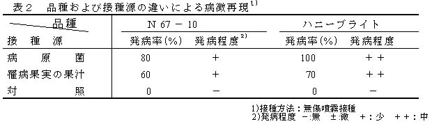 - 花樟病の発病に対する品種間差は、接種源に関わらず「N67-10」に比較して「ハニーブライト」では発病率、発病程度とも高い。特に、病原菌噴霧接種では全果発病し、花樟病に弱い品種である。接種源には、病原細菌をYDC培地およびMMG培地に培養後、10ー4に希釈した懸濁液を用いる方法が最も良いが、罹病果実の果汁を用いた噴霧接種でも60〜70%の発病は認められることから、病原細菌を確保できない場合には、本手法の利用も可能である(表2)。