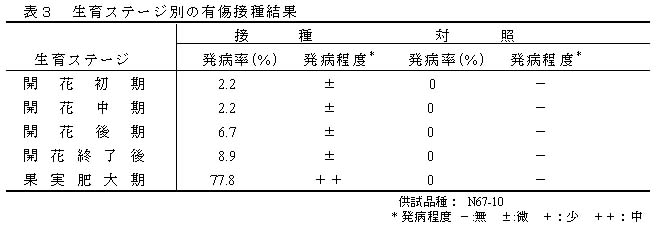 生育ステージ別では、開花初期、中期、後期、終了後の有傷接種では発病率は低い。しかし、果実肥大期に接種を行うと病徴が再現される(表3)。