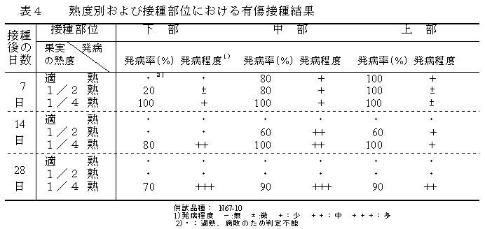 適熟果実および1/2熟果実は接種後腐敗を生じるのが多く発生し、病徴の確認が困難になる場合がある。しかし、1/4熟果実では、接種後判定を行うまでの日数が短ければ発病程度は軽いが、接種後28日目には発病程度3であることから、接種に適すると考える。また、接種を行う部位は、発病率、発病程度から果実中央部付近が良い(表4)。