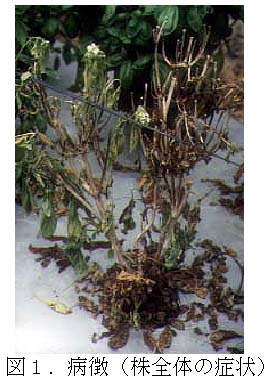 病株は、株全体が萎凋した後、立枯症状(図1)を呈し、茎部には褐色から黒色の病徴(図2)を呈する。また導管部には褐変症状が観察され、根も黒色〜褐色腐敗症状を呈する。