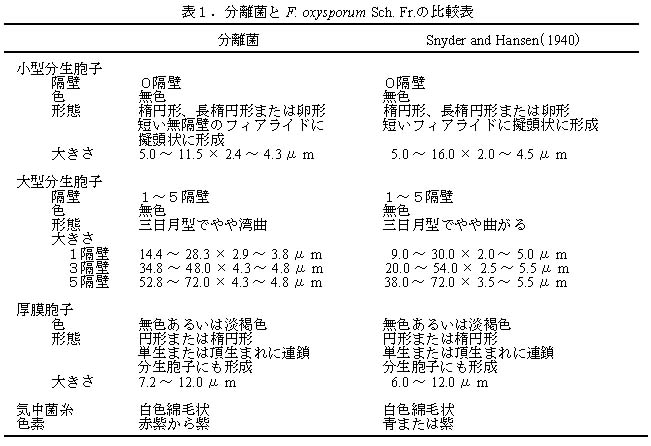- Fusarium oxysporum(松尾、1969)との形態的諸性質の比較においてほぼ一致する(表1)。