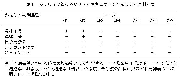 表1 かんしょにおけるサツマイモネコブセンチュウレース判別表