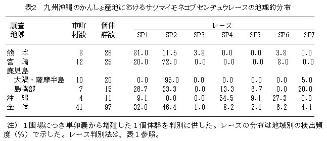 鹿児島県は大隅、薩摩半島ではSP2が95%、他の島嶼部ではSP3以外のレースが局地的に分布する(表2)。