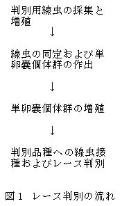 レース判別には、200〜300個の卵嚢から摂氏25度で2昼夜孵化させた、新鮮な2期幼虫を供試する。