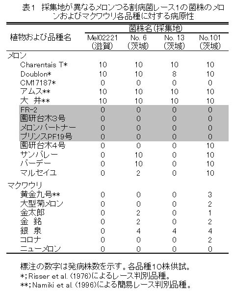 滋賀県産レース1菌株に抵抗性であるメロン品種のうち、「園研台木4号」、「サンバレー」、「バーデー」および「マルセイユ」は茨城県産レース1菌株のいずれかの菌株に罹病性であるが、これらを除く、「FR-2」、「園研台木3号」、「メロンパートナー」、「プリンスPF19号」はどの菌株にも抵抗性であり、レース1の発生地域での被害回避に利用できる(表1)。