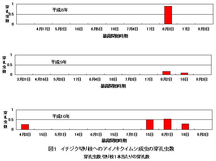 イチジク株枯病菌を媒介するアイノキクイムシ成虫は、4月上旬と7月中旬〜8月下旬の2回、移動分散する。本種には有機リン系の殺虫剤であるMEP水和剤やDMTP水和剤が有効である。
