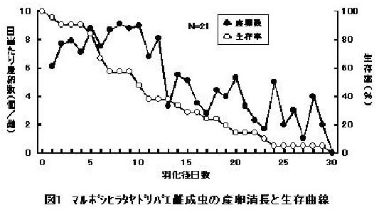 図1 マルボシヒラタヤドリバエ雌成虫の産卵消長と生存曲線