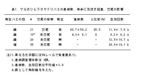 表1 マルボシヒラタヤドリバエの産卵数、寿命に及ぼす経産、交尾の影響