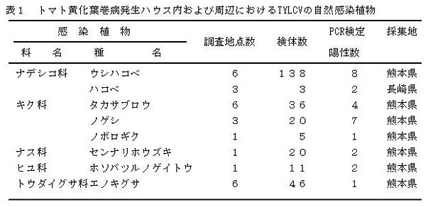 - TYLCVは、トマト黄化葉巻病発生ハウス内あるいはその周辺に自生するウシハコベ(Stellaria aquaticaナデシコ科)、エノキグサ(Acalypha australisエノキグサ科)の他に、ノゲシ(Sonchus oleraceusキク科)、ハコベ(Stellaria mediaナデシコ科)、タカサブロウ(Eclipta prostaraキク科)、ノボロギク(Senecio vulgarisキク科)、センナリホウズキ(Physalis augulataナス科)およびホソバツルノゲイトウ(Alternanthera nodifloraヒユ科)に自然感染する(表1)。