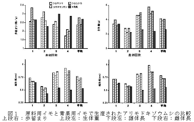 歩留まりは、4回の産卵を平均すると、いずれの原料用サツマイモも土佐紅と差は見られない。土佐紅での幼虫の歩留まりは4回の産卵とも安定していたが、原料用サツマイモでは1回目または2回目にピークがあり、しだいに低下する(表1、図1)。