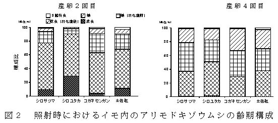 図2 照射時におけるイモ内のアリモドキゾウムシの齢期構成
