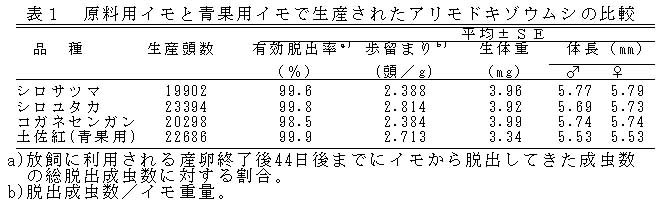 表1 原料用イモと青果用イモで生産されたアリモドキゾウムシの比較