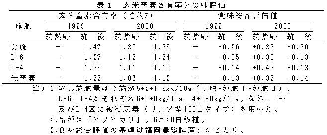 被覆尿素のみで全窒素量を30〜50%減じて全量基肥施用すると、慣行の分施よりも玄米窒素含有率が低く、食味も向上する(表1)。