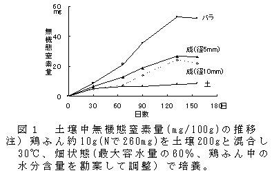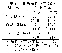 エクストルーダ成型鶏ふん堆肥を土壌に施用すると、土壌中の無機態窒素量は原料のバラ鶏ふん(成型堆肥の原料である発酵鶏ふんを、そのまま無機化試験に供試)に比べ少なくなり、窒素無機化率はバラ鶏ふんの3〜4割である。成型鶏ふん堆肥の比較では、直径の大きい10mmが5mmより窒素無機化率が低い(図1、表1)。