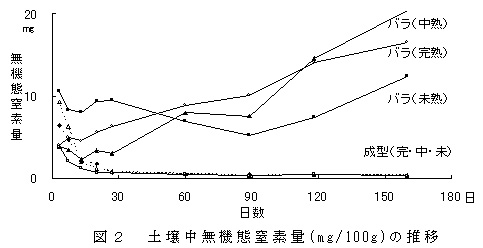 原料であるモミガラ牛ふん堆肥(バラ牛ふん堆肥)の土壌中無機態窒素量は、腐熟度の相違により著しく変動する。一方、成型牛ふん堆肥では、いずれの堆肥も土壌に施用後は速やかに窒素の有機化が進み、土壌中の無機態窒素が急激に減少するため、窒素の肥効は非常に低い(図2)。