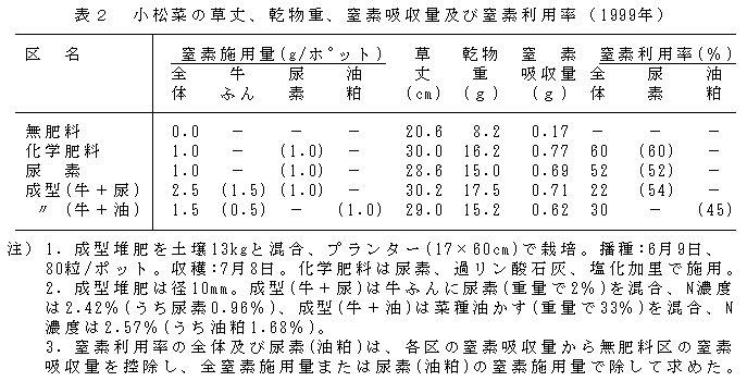 表2 小松菜の草丈、乾物重、窒素吸収量及び窒素利用率(1999年)