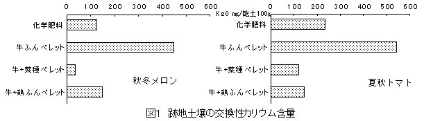 牛ふん堆肥に菜種油粕をブレンドした成型堆肥を秋冬メロンおよび夏秋トマトに窒素の肥効率に基づいて全量基肥施用すると、跡地土壌の交換性カリウムの集積は牛ふん成型堆肥の20%以下に軽減される。また、牛ふん堆肥と発酵鶏ふんをブレンドした成型堆肥を施用しても、牛ふん成型堆肥の30%以下となる(表1、図1)。