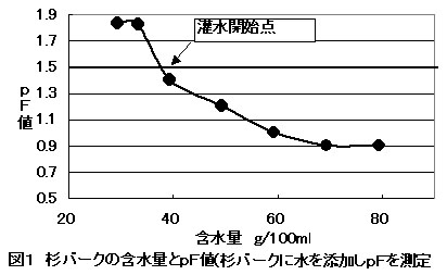 杉バークの含水量(体積当たり水分量)はpF1.5前後で大きく変化することから、pF1.5をかん水開始点とする(図1)。かん水は、タイマーと水分センサーを併用し、日中は毎時かん水状態とし、水分センサーがpF1.5となり、タイマーと同時出力状態となった時に80ml/回(0.5t/10a)をかん水する。