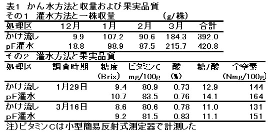 株当たりの収量は、かけ流し方式よりpFかん水方式の方が勝る(表1)。また、果実中の糖度やビタミンC、全窒素濃度は、pFかん水方式がかけ流し方式より高い(表2)。