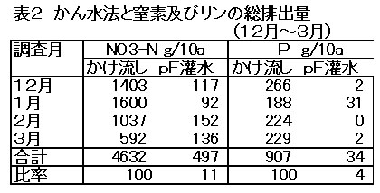 - 排液中の硝酸態窒素濃度は約30〜100ppm、リン濃度は10〜25ppmであるが(データ省略)、10a当たりの総排出量は、かけ流し方式では窒素4.6kg、リン0.9kgに対し、pFかん水方式では窒素でその11%、リンで4%に削減できる。