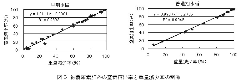 - 被覆尿素肥料の重量減少率(X)と窒素溶出率(Y)には、早期水稲でY=1.011X‐0.038(R2=0.989)、普通期水稲でY=0.991X‐0.271(R2=0.995)と高い正の相関がある(図3)。