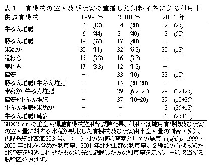 表1 有機物の窒素及び硫安の直播した飼料イネによる利用率