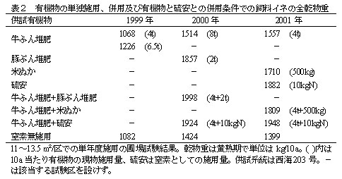 表2 有機物の単独施用、併用及び有機物と硫安との併用条件での飼料イネの全乾物重