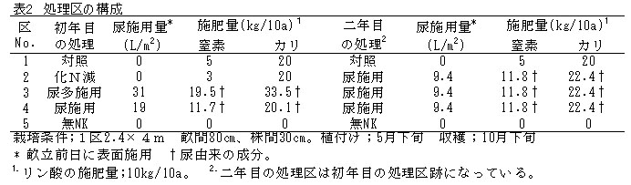 尿施用区(表中No.4)の窒素の養分収支は3kg/10aのプラス、カリの収支は対照区と同等の5kg/10aのプラスであり、跡地土壌の交換性カリウム含量並びにECは対照区と比べて増大しない(表4)。