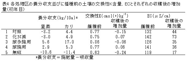 表4 各処理区の養分収支並びに播種前の土壌の交換性K含量、ECとそれぞれの収穫後の増加量(初年目)
