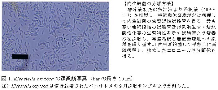 - 半流動無窒素培地を用いて、表面殺菌したサツマイモの茎(品種:ベニオトメ、コガネセンガン、シロユタカ)の磨砕液または搾汁液より11株の内生細菌を分離した。これらの分離株のアセチレン還元活性(以下ARA)を調べると2株の陽性が確認でき、そのうちの1株が16SrRNA部分配列分析によりKlebsiella oxytocaと同定された。