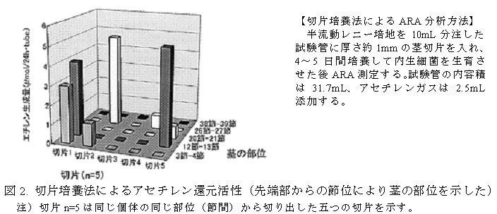 図2 切片培養法によるアセチレン還元活性(先端部からの節位により茎の部位を示した)
