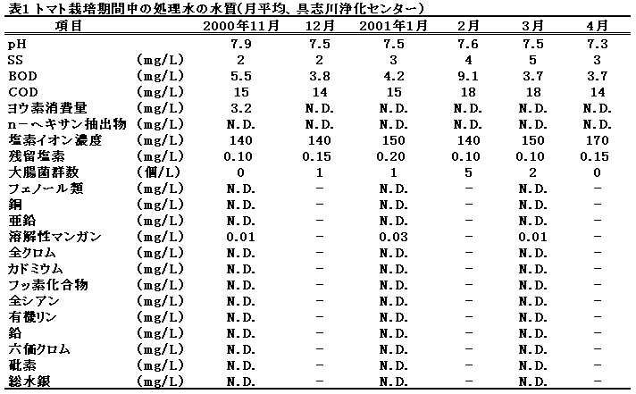 表1 トマト栽培期間中の処理水の水質(月平均、具志川浄化センター)