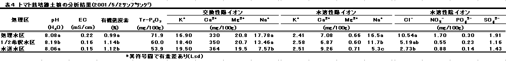 表4 トマト栽培跡土壌の分析結果(2001/5/2サンプリング)