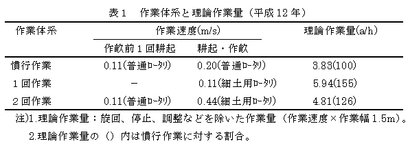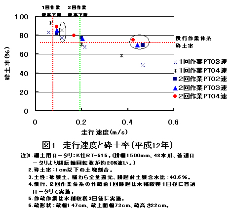 - 細土用ロータリ、作畝、走行速度、砕土率、作業能率