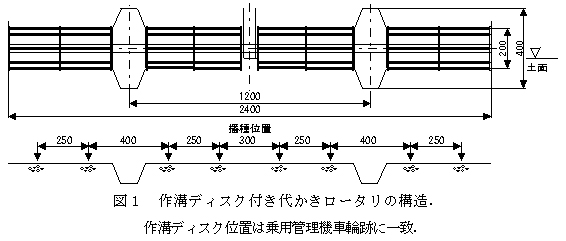 試作した作溝ディスク付き代かきロータリは、乗用管理機の車輪跡をそのまま溝に成形するための作溝ディスクを簡易な代かきロータリに装着したものであり、落水管理のための作溝と播種深度確保のための土壌表面の攪拌を同時に行うことが可能である(図1)。