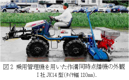 乗用管理機を利用した水稲の作溝同時湛水点播技術