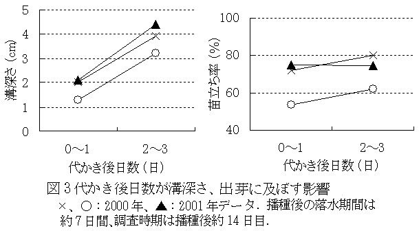 図3 代かき後日数が溝深さ、出芽に及ぼす影響