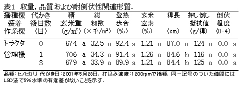 上記ロータリと打込み点播機を装着した乗用管理機(図2)を用いて播種を行っても、トラクタに点播機を装着して代かき同時播種を行った場合と比較して、収量、品質および耐倒伏性に差を生じない(表1)。