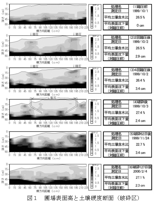 圃場表面沈下量は、2〜4回と機械踏圧を受ける毎に増加する。土壌硬度は踏圧部分の直下で顕著に増加する(図1-(1)(2)(3))。
