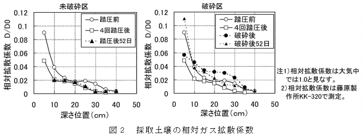 ハーベスタで4回踏圧後の深さ10cm以上の土壌の相対ガス拡散係数は0.02を下回っており、土壌通気不良により根の生育阻害が起きる可能性がある。破砕後は相対ガス拡散係数は0.02より高い値に改善され、全層破砕は、作物根の通気環境の改善にも効果がある(図2)。