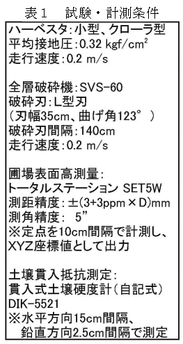沖縄の国頭マージと呼ばれる赤黄色土壌は、粘土含量が高く乾燥密度が高いため圧密化・硬化する性質があり、この土壌では主にサトウキビが栽培されている。省力化のため導入が進むハーベスタの踏圧等により土壌硬化が進み、サトウキビの収量や生育に対して悪影響を及ぼしていることが懸念されている。また、圃場内土壌の乾湿程度を簡易に把握する手法が現場から求められている。これらの問題に対応するため、国頭マージ土壌の圃場においてハーベスタによる踏圧と振動式全層破砕機による破砕試験を行い、機械踏圧による土壌硬化の実態と破砕の効果を、測量から求めた圃場表面高と土壌貫入抵抗測定(表1)から求めた土壌硬度との精密分析や採取土壌分析等の手法を用いて、土壌物理性の側面から明らかにするとともに、分析手法の有用性について検討する。