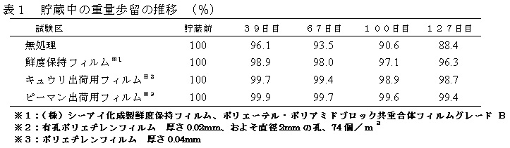 重量歩留まりは、キュウリ出荷用フィルム(以下フィルムKとする)及びピーマン出荷用フィルム(以下フィルムPとする)区で高くなる。これに対し鮮度保持フィルムグレードB(以下フィルムBとする)区は低くなるが、無処理区に比べかなり高い(表1)。無処理区では、67日目に果実表面の萎凋による軟化が現れるが、包装区では認められない。