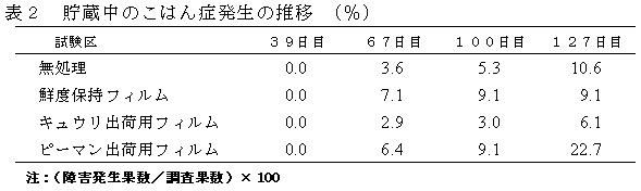 貯蔵中、果面障害のこはん症の発生がみられ、フィルムP区で22.7%と高くなるが、他の区では1割程度の発生にとどまる(表2)。