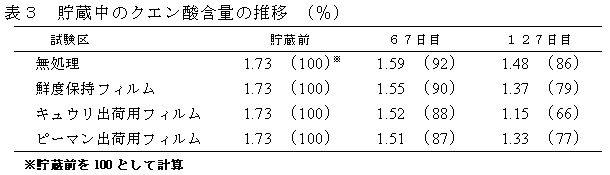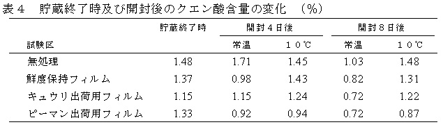 貯蔵終了後、包装資材から開封した後の管理では、概ね摂氏27度下の常温放置より摂氏10度での低温管理でクエン酸含量の減少を抑制することができる(表4)。
