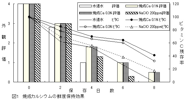カット前の洗浄では、焼成カルシウム水溶液による洗浄はビタミンCの減少や外観評価の低下が緩やかとなり鮮度保持効果は高く、処理濃度は0.1%,処理時間は3分程度が適当である(図1)。