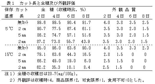 葉ネギはカットすることで、糖分含量及び外観品質の低下が速まる(表1)。