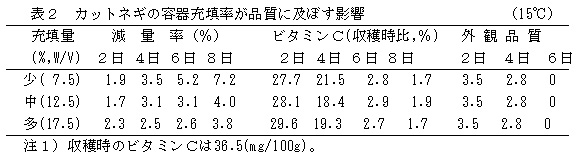 カットネギのプラスチック容器への充填率(W/V)が鮮度に及ぼす影響は、充填率の7.5〜17.5%では充填率が低いと保存中の減少率がわずかに高いが内容成分や外観品質には影響しない(表2)。