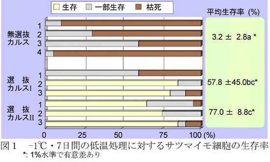 図1 マイナス摂氏1度・7日間の低温処理に対するサツマイモ細胞の生存率
