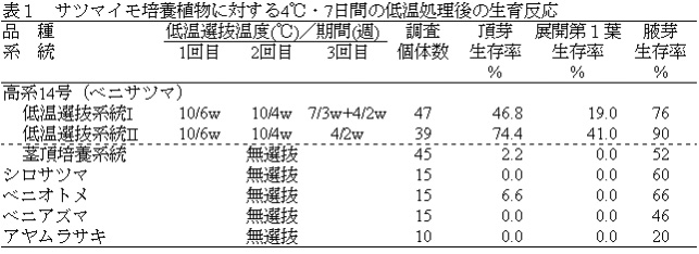 表1 サツマイモ培養植物に対する摂氏4度・7日間の低温処理後の生育反応